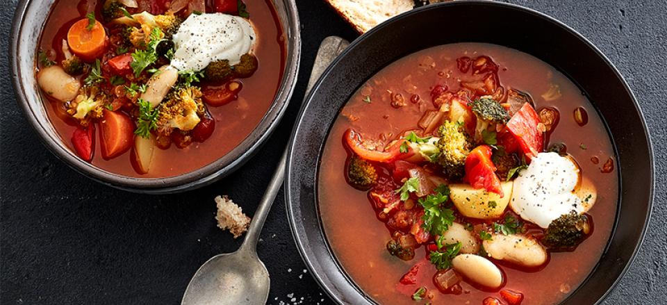 Varm grøntsagssuppe med kartofler, tomat og snackpeber