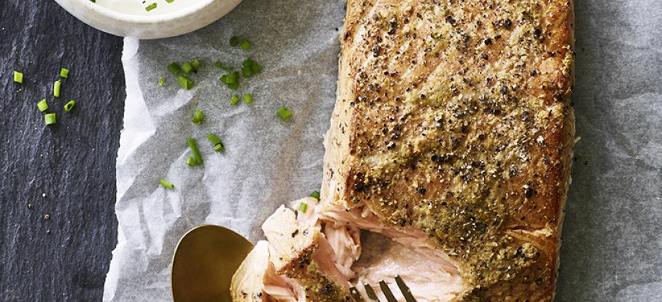 Du skal bruge røgsmuld til denne opskrift. Drys fisken med salt og sukker og lad den trække natten over i køleskabet.