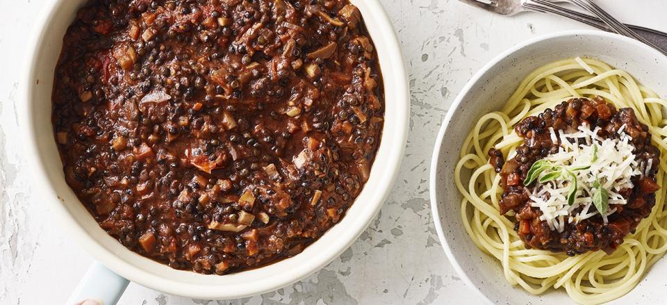 Skyl linserne i koldt vand, og kom dem i panden med balsamicoeddike, laurbærblade, hakkede tomater, vand og oregano.