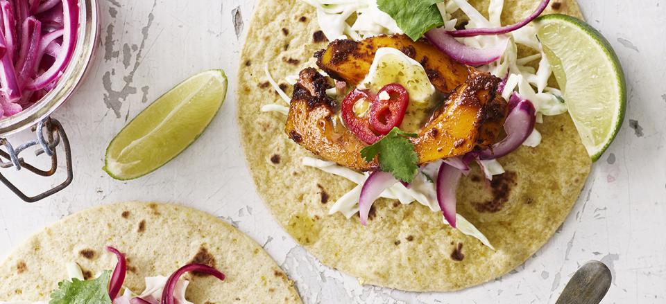 Lun tortillaerne, og fyld dem med coleslaw, squash, salsa og løg.