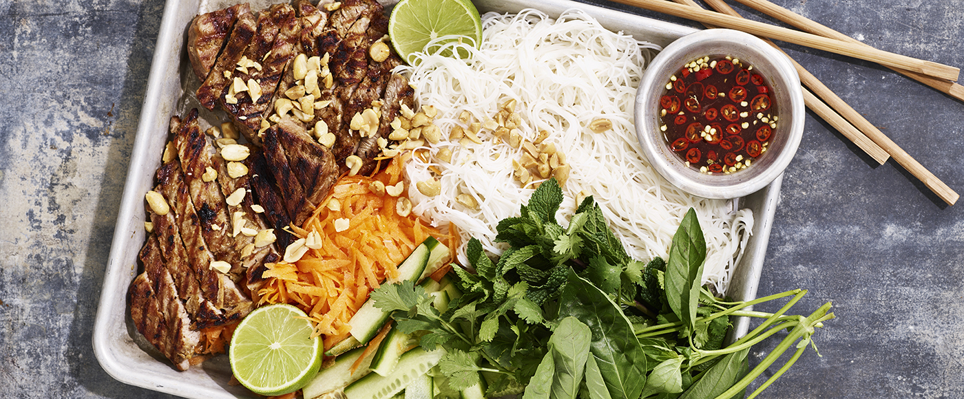Vietnamesisk grillet gris med risnudler og urter