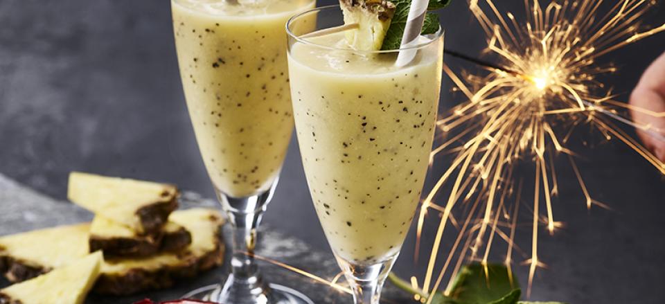Hæld på glas og pynt med ananas, mynte og den sidste passionsfrugt.