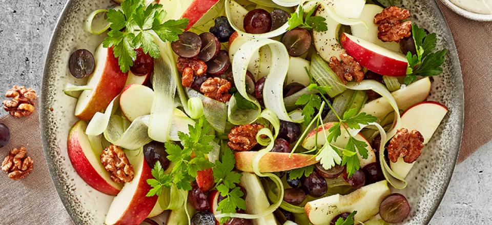 HjemOpskrifterWaldorfsalat med æbler, røde druer, bladselleri, persille og honningkandiserede valnødder
