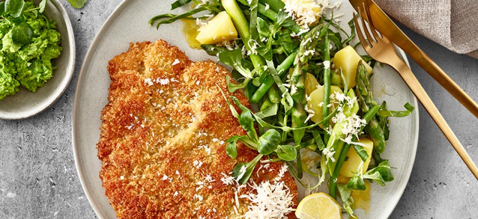 Wienerschnitzel med grøn kartoffelsalat og knuste ærter