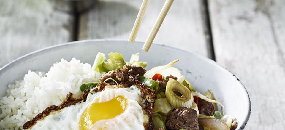 Wokstegt hakket oksekød med spidskål, bønner og spejlæg