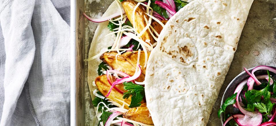 Varm tortillas efter pakkens anvisning og fold sammen om persillesalat, ristede kartofler og lidt revet vesterhavsost.