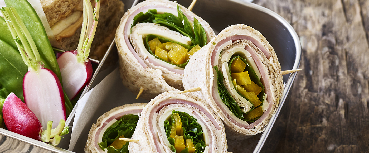 Rul tortillaen stramt sammen, og skær den i tykke skiver.